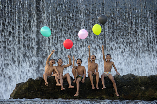 The children holding onto colourful balloons in the air represents the vibrancy of life.