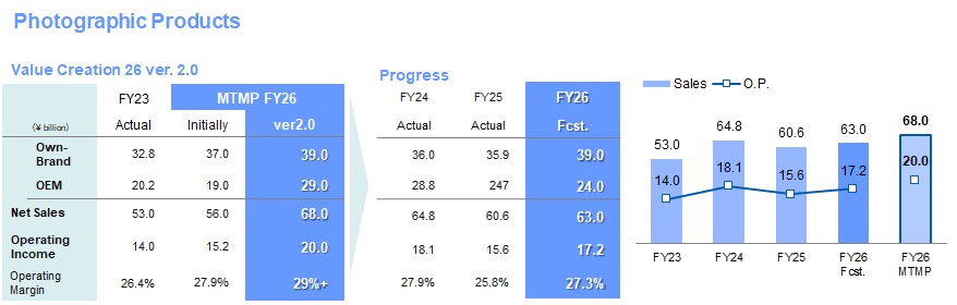 - ⇒Adjust the sales composition ratio of the Photographic products business from 3/4 to 2/3.(aiming to approx. 70% in 2026)