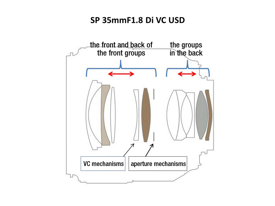 Instead, Tamron chose to adopt a floating system. Ordinarily, one group of lenses is moved to the front and back for focusing, but in this case, multiple groups of lenses are moved to the front and back in complex ways for focusing, which enables effective compensation for any aberrations. This floating system is used for the SP 35mm and SP 45mm models in the SP series featuring a new concept.