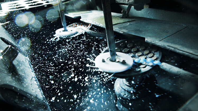 Lenses are meticulously polished by flowing a dedicated abrasive compound onto a polishing disk that rotates at high speed.