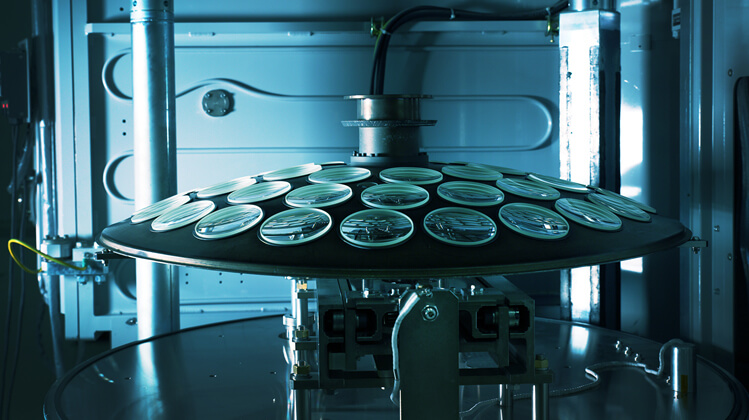 A batch of elements is placed on an umbrella-shaped dome and transferred into a high-vacuum coating chamber in a clean room environment.