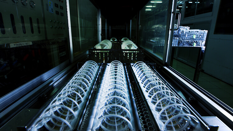 Residuals from the polishing process are removed using ultrasonic cleaning equipment. After cleaning, elements are transferred to an assembly line.