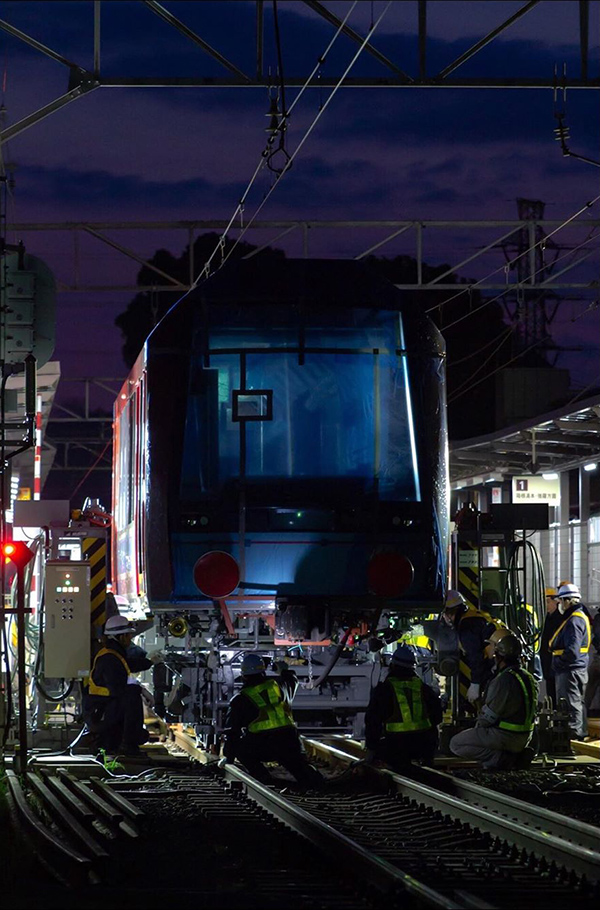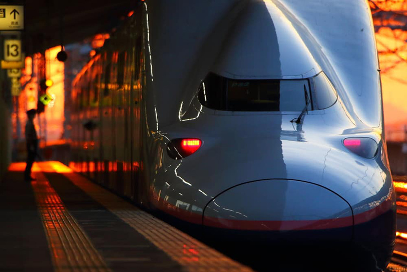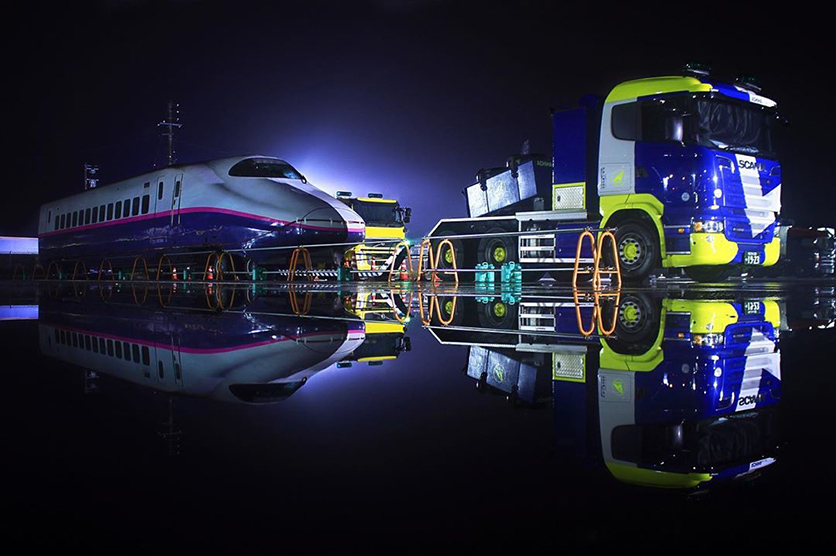 E2系新幹線が陸送される、とても珍しい場面です。水面に綺麗に反射している光景を見たとき、作者の方も驚いたのではないでしょうか。そうした心境で、このように落ち着いて構図を決めてシャッターを切ることは、なかなか真似できることではありません。黒い背景に派手な色のトレーラーヘッドと白いボディのE2系が見事に浮かび上がり、停まっていることに力強さを感じます。水鏡を利用した作品は度々見られますが、この作品ではE2系が歩んできた今までの世界と、これから迎える世界の2つを表していると捉えることもでき、意味のある作品に仕上げています。