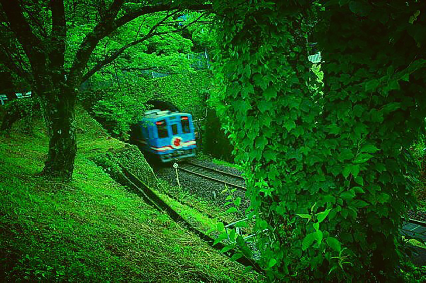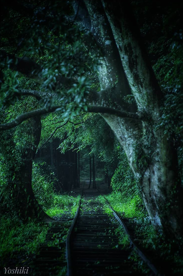 まさに「インスタ映え」の領域を越えている作品です。これは鳥取県を走っていた倉吉線の廃線です。廃線跡を捉えた作品は他にも多くの方が応募されましたが、この作品の面白いところは、手前に今にも線路に被さりそうな太い木を配し、線路が続く奥行きを作ることで列車が走っていた当時を想像させておきながら、奥にある線路の中央に生えた細い木が視線を遮り、ここが廃線であるという現実を強烈に突きつけていることです。手前から奥に向かって暗→明→暗→明と明るさが交互に変わっていることも奥行きのある絵作りに役立っています。