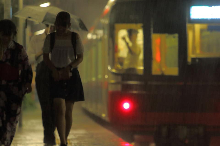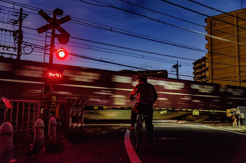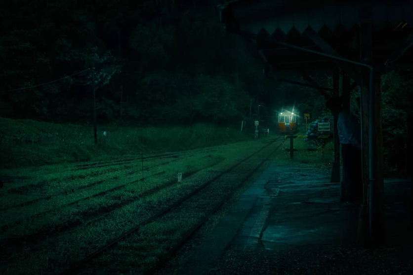 「被写体全てが役者だな」と見た瞬間に思いました。まず目が行く左手前の二人は下を向いて歩いていながら、後ろの人物が傘をさしていることで、激しい雨が降っていることがわかります。車掌さんが車内の灯りにうかびあがり、指で何かを確認していることから、じきに発車することが伺えます。私たちが雨の駅を想像した際に、思い浮かべるシーンを形にしたと言えますが、写真にするのは容易ではなく、その瞬間まで長時間待つ忍耐力か、すぐにそうした瞬間を呼び寄せる強運がなければ成り立ちません。調和の取れた構図や夜間の難しい露出あわせといった技術力も備わっていると言えます。