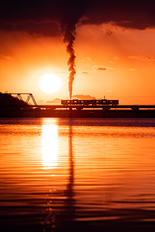 煙と太陽と列車が織りなす強烈なインパクト。通勤電車がまるで蒸気機関車のように見えます。見れば見るほどに引き込まれる不思議な作品です。それでいて、どこか懐かしさを引き起こす、心にひびく情景・・・。参りました。全てが合致した、一瞬の風景はまさに「写真でしか味わえない感動」です。