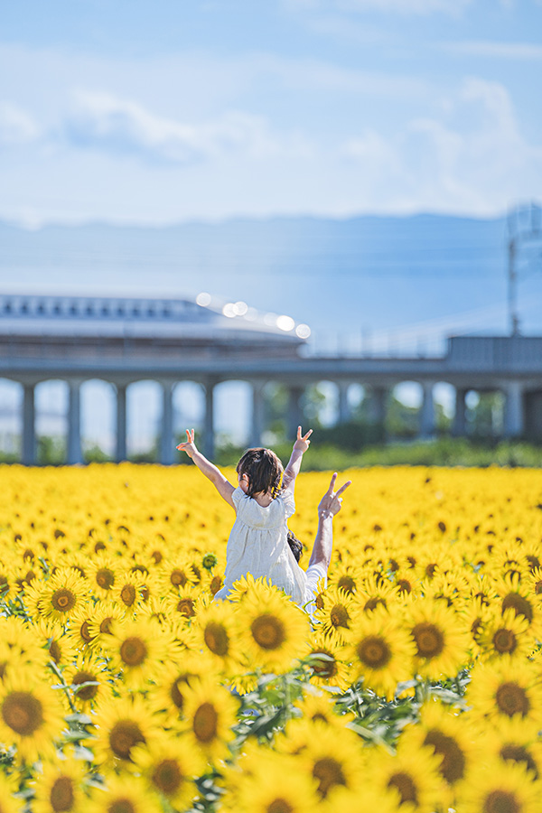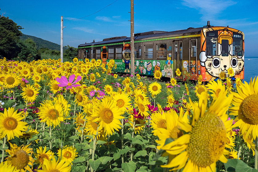 いまや大人気となった下灘駅が舞台の一枚です。地元の方が大切に育てた向日葵と、愉快な列車のコンビが夏の明るい季節を体現しています。列車のラッピングを上手に扱った好例です。よく見ると、お花も一輪ごとに姿が違いますね。また一輪だけ存在を主張するコスモスもおちゃめです。じっくり見ると個性が感じられます。画面全体が可愛らしく賑やかです。それでいて、そつなく上手に全体をまとめています。これほど可愛らしい鉄道写真は見たことがありません。きっと鉄道が楽しいと心の底から思うからこそ、撮影できた一枚だと感じました。