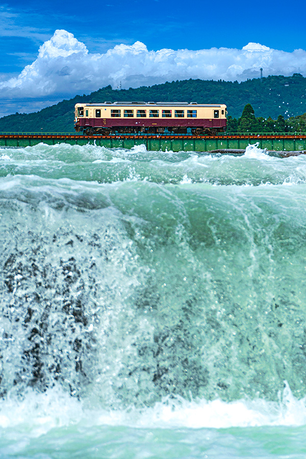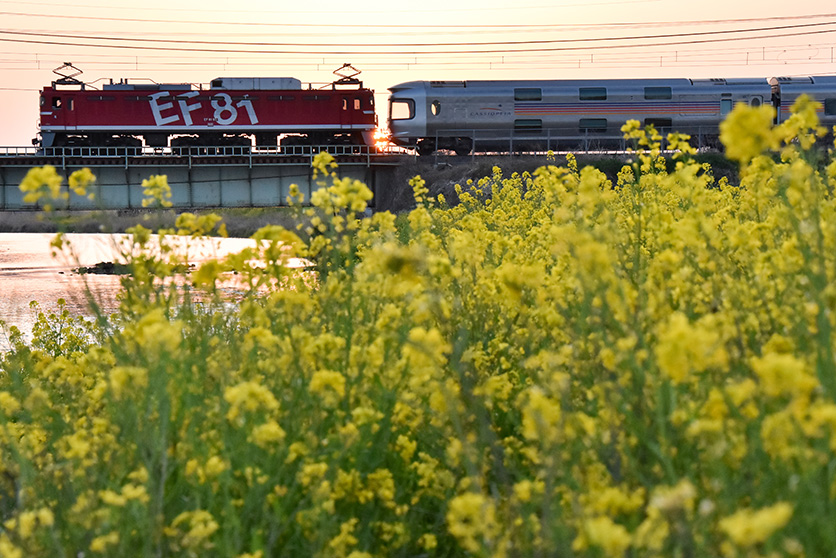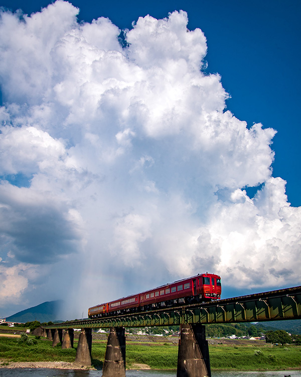 こちらの作品は鉄道写真の様式美を感じる、堂々とした鉄道写真です。地震で不通となった新幹線の代わりに活躍した、在来線の臨時列車です。ピンチヒッターとして、颯爽と現れた伝統の国鉄カラーの列車です。まるで満開の桜も列車を応援しているようです。鉄道の絆と勇ましさを感じる作品です。構図のバランスやレンズ焦点距離も好ましい選択をしています。天気もバッチリで、線路が遠くまで写っているのも良いですね。桜並木の上から、冠雪の山が見えるもの良い塩梅です。じっくりと一瞬を狙い定めた、鉄道写真の王道といった一枚です。