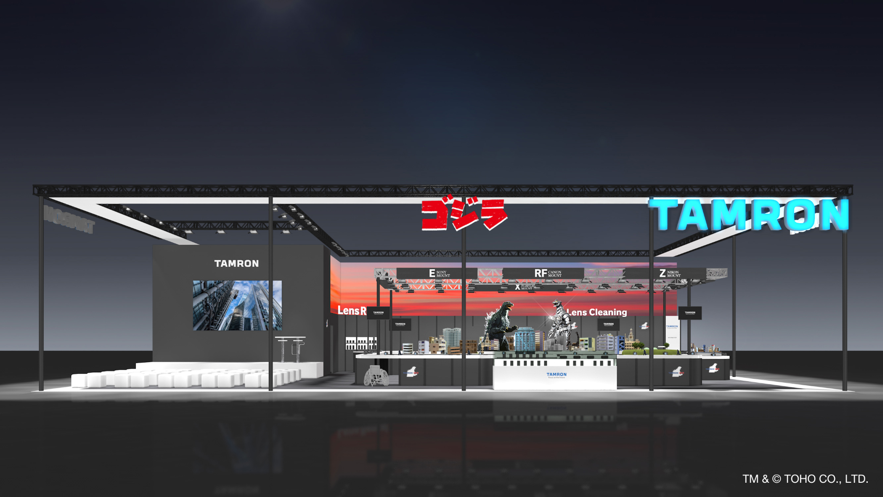 今年のブースは、写真を愛するすべての方に特別な撮影体験をご提供するため、ゴジラとコラボレーションをしております。ブース中央には、特撮映画のセットをイメージしたジオラマを展示。その被写体を取り囲むように、タムロンの最新レンズ、おすすめレンズをご用意しています。また、来場者の皆様にスライダーを活用した特撮やゴジラとミニジオラマの接写撮影を体験できるコーナーなどもご用意しています。タムロンとゴジラが交差する今年のタムロンブースの世界観をお楽しみください。