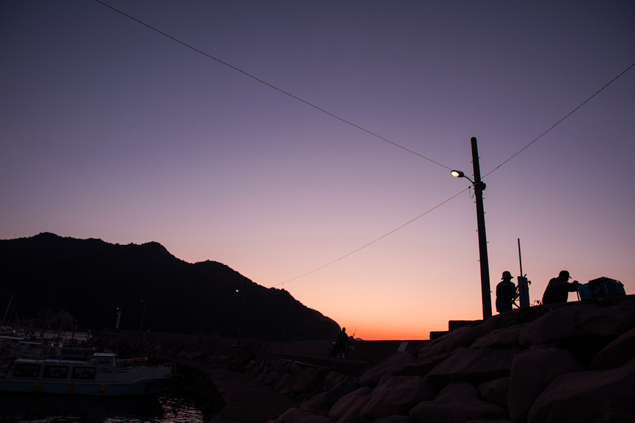海の洞窟など自然の力、柱状節理によって創られた島々の絶景スポットとして有名な国の天然記念物、芥屋の大門。そこを巡る周遊観光船や釣り船が停泊する小さな港の夕暮れ。釣果を乗せた自転車を押して家路へと向かう人たち。。