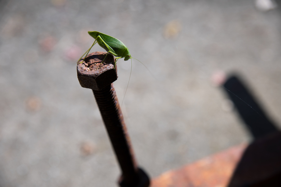 バス停の待合小屋に落ちていた農機具に登っていたのはキリギリス、、、だと思うが、もしかしたらウマオイかなぁ?? 子どもの頃にはいろんな種類の昆虫を捕ったりして遊んでいたことを思い出させてくれた。