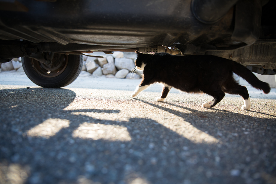 港にネコは付き物である。駐車場にもたくさんのネコたちが日向ぼっこをしたり、毛繕いをしてのんびり寛いでいた。クルマの下を自分の陣地としている子ネコを見つけたのでローアングルでカメラごと入り込んでみたが、素早い動きで逃げようとしたのでこちらもすかさず後を追ってシャッターを切った。