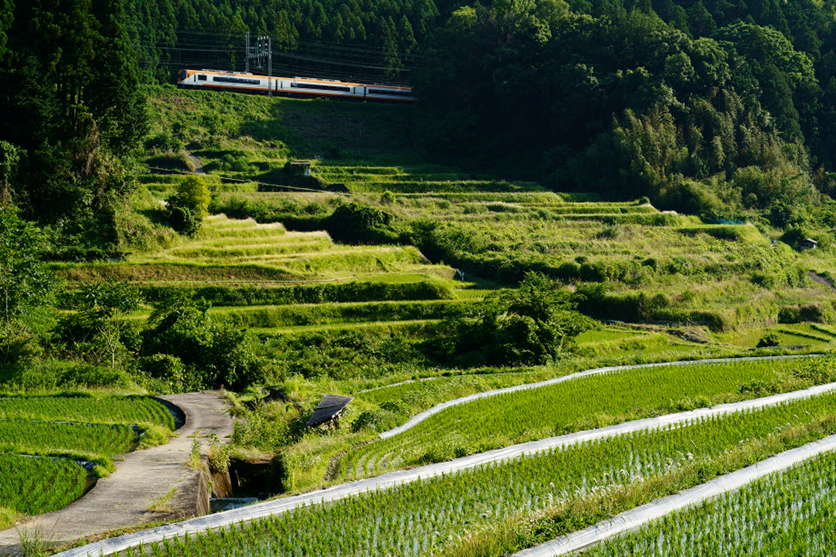 日が傾いた頃、棚田の向こうを駆け上がる「ACE」を半逆光で撮影してみます。BBAR-G2 (Broad-Band Anti-Reflection Generation 2) コーティングが採用されているので、影の部分も真っ黒に潰れずに描き出してくれました。可能な限りローアングルで撮影するために、三脚の脚にクランプ(棒状や板状の部材を挟み込んで固定し、雲台を取付けることの出来る器具)と自由雲台をつけて、小型な機材であることを活かしてガードレールの下の僅かな隙間からレンズを線路に向けます。軽いレンズなので自由雲台の操作も簡単で、すぐに思い通りの構図を組めました。
