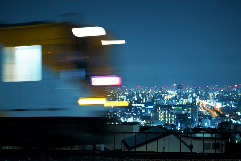 大阪と奈良を結ぶ奈良線。石切駅付近では眼下に大阪平野を望めます。ここはF2.8の美しいボケ味を活かして、絞りを開放にして大阪の夜景をボカし、低速シャッターで列車の動感を出します。家路につく人々を乗せた「ビスタカー」が生駒山地へと駆け上がっていきます。F2.8であるからこそ得られた、ボケ味の美しい写真に仕上げることができました。