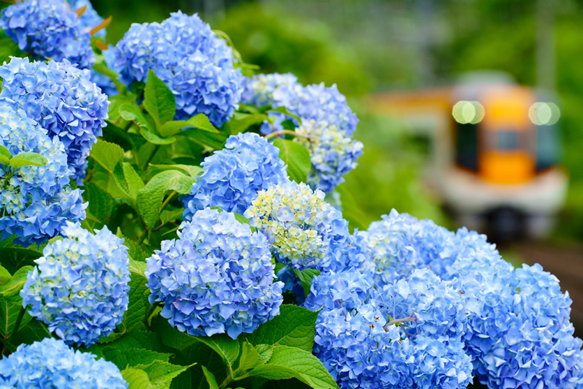 小さな踏切の傍に、見事なアジサイが咲いているのを見つけました。しっとりとした天気が良く似合います。アジサイにピントが合う範囲や背後の列車のボケ方を考慮してF8で撮影しました。AFである程度ピントを合わせたあと、必要に応じてMFで微調整するダイレクトマニュアルフォーカス(DMF)を試しました。右下手前の花にフォーカスエリアを設定しAFで合わせ、MFで微調整します。このような場面でDMFがしっかり機能しました。
