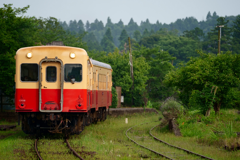 小湊鐵道へ舞台を移し、以下4点の作品は全て開放F2.8で撮影しました。まずは上総鶴舞駅を発車する列車を狙います。APS-Cモードを使った270mm相当の画角です。シビアなピントが求められるF2.8での撮影ですが、リニアモーターフォーカス機構「VXD」によるAFは寸分の狂いもなく、西日を浴びた列車の顔にピントを合わせてくれました。線路まで緑に覆われた南国ムードの溢れる背景も、綺麗にボケるからこそ、その雰囲気が伝わります。