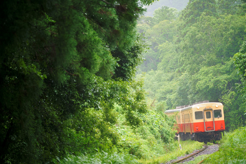F2.8は前ボケを活かした風景カットでも有効です。ピントを画面の奥にあわせ、手前をボカすことで、目線は自然と奥へと流れていきます。降り続く雨の中、鬱蒼とした森の向こうから列車が現れました。木の葉の1枚1枚の色の違いや、列車から滴る雨粒といった、空気感までも捉えることができました。
