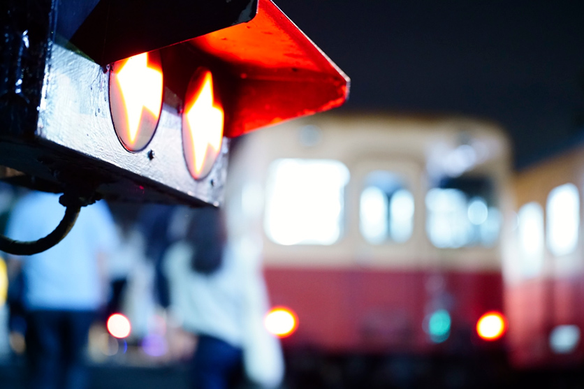 このレンズはズーム全域で最短撮影距離が0.85mまで寄れるので表現の幅が広がります。作例もおよそ0.85mまで近接し、開放F2.8で撮影をしました。背景を劇的にボカした印象的な写真となりました。構内踏切のある上総牛久駅、警報器が列車の出発を告げます。柔らかく光る矢印や、何度も塗り直されたであろうペンキの痕跡も捉えてくれます。乗客の後ろ姿が良いアクセントになりました。