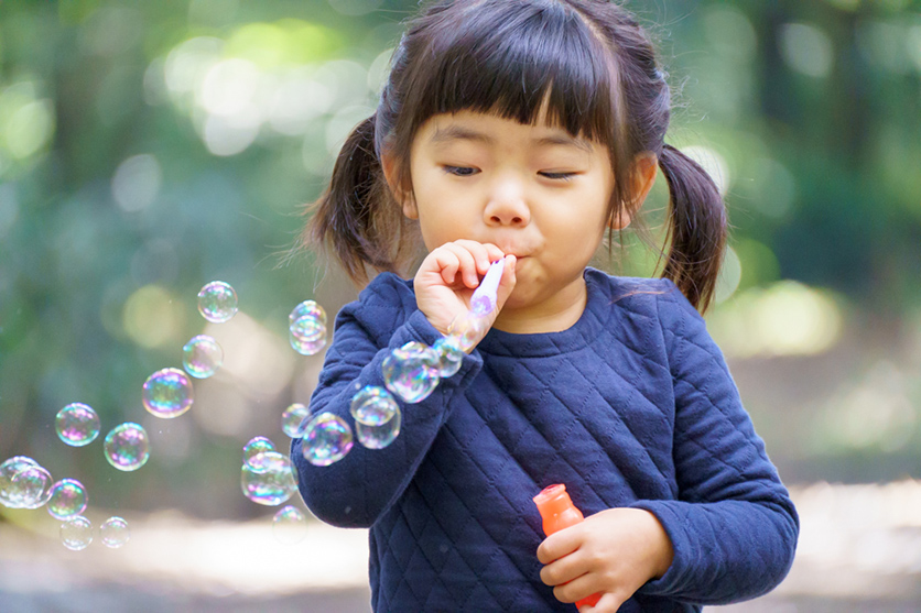 実は、望遠レンズを使えば開放F値が小さくなくても大きな背景ボケが得られます。また遠くにいる子どもを大きく撮るというわけではなく、子どもの背景を大きくぼかすような写真を撮りたいときにも望遠レンズを使います。