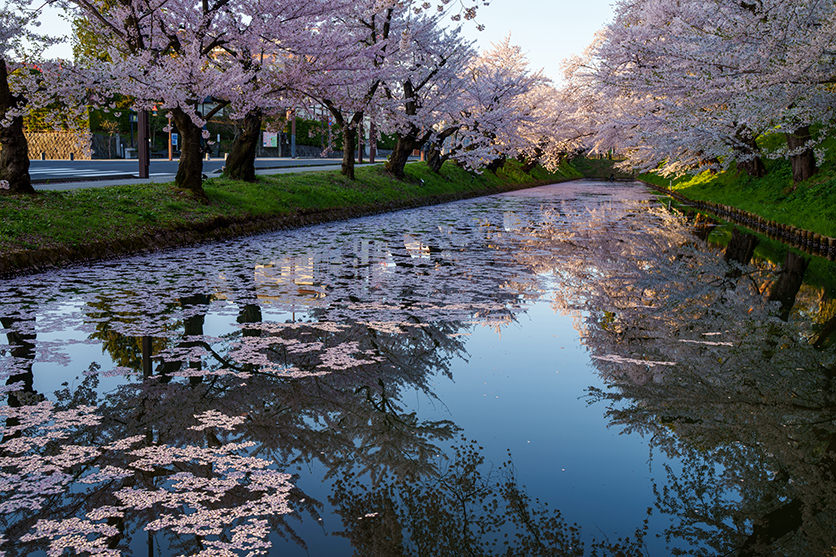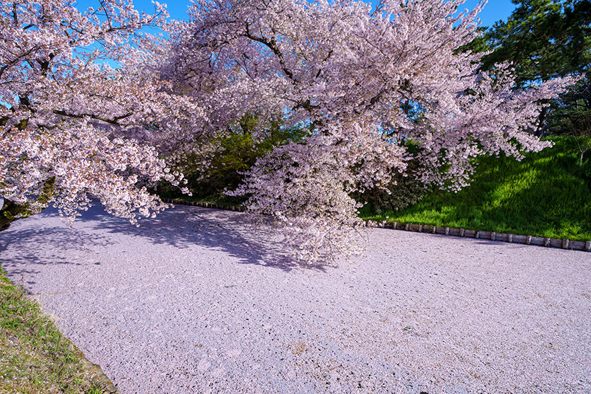 はい、ドーンとまずはこれです。弘前といえば、このお堀が一面ピンクに染まる、散り際の花筏!こういう時、広角があってよかったと心底思う一瞬です。この写真のお堀の右側を少し下ったところにある角から、望遠で圧縮を効かせて花筏を撮った写真はよく見かけるのですが、こんなに豪勢に、堀の端から端まで全部花弁が散っているのを実際に目の前にすると、広角のパースを活かして広大に描写したくなりました。超小型の広角レンズである17-28mm F2.8 (Model A046)は使い勝手も良く、腕を目一杯上に伸ばした体制で撮影しているこの一枚でも、なんなく全貌を綺麗に収めることができました。