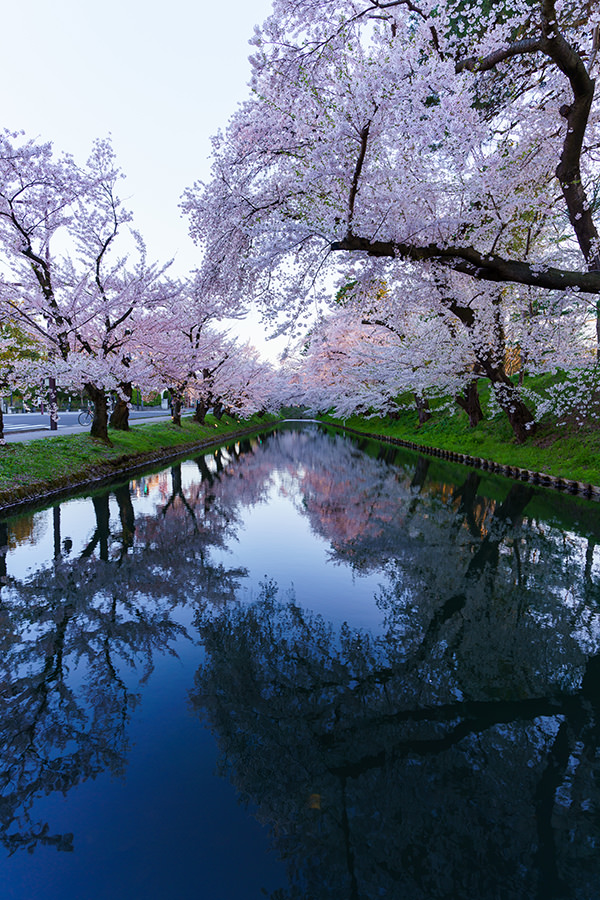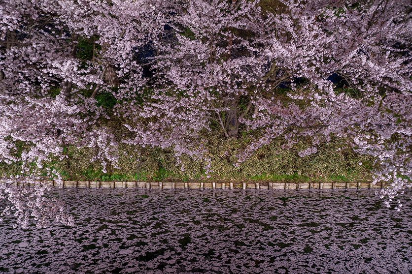 広角といえばパースを効かせた表現が魅力ですが、単純に「広い」というのも大事な要素。特にリフレクション撮影の時、上側に広がる桜の枝ぶりと堀に映る様子の上下ともに捉えたいとなると、標準では絶対に追いつきません。ここは望遠で撮っても綺麗だし、標準で撮っても画になりますが、こういうちょっとダイナミックな桜の枝に出会うと、内心ニヤニヤしながら広角をおもむろにカメラバッグから取り出すわけです。すでに撮る前からこの画が見えていました。この豪快な枝ぶり、最高じゃないですか?