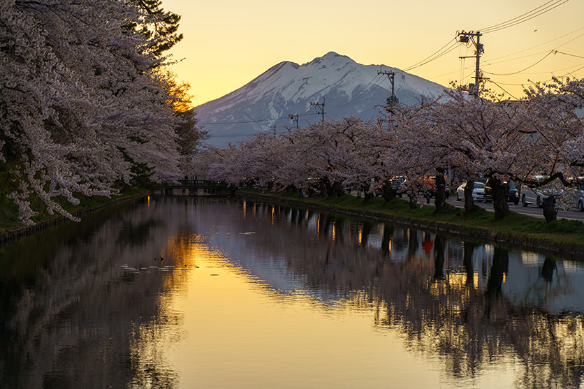 今回の記事の最後は、この一枚で。同じ場所から望遠70-180mmで撮った4枚目の写真とぜひ見比べてください。望遠が圧縮効果を使って山の存在感を引き出すとするならば、標準を使って撮るのは、場の空気、その瞬間の記憶、想いです。この写真は、到着してすぐに撮影したものです。噂に聞く「弘前の夜桜」を前に、徐々に暮れなずむ街。お堀の角を曲がった瞬間に目の前に現れた岩木山と、穏やかに暮れる夕焼け空。そして桜。じんわりと胸の内に広がる「弘前に来たんだ」という喜びが、そのまま画になった一枚です。まだなんのレンズを使うかも決めていないままバッグから取り出したカメラには、いつも付いている標準レンズの28-75mm F2.8。そんな「意図しない瞬間」を撮るレンズだからこそ残せる一枚って、確かにあると思うんです。エモでしょ。チルくてエモくて、そんな桜が散る(チルとかけてます!!)時の世界を、「標準レンズ」が全部補完してくれるのです。
