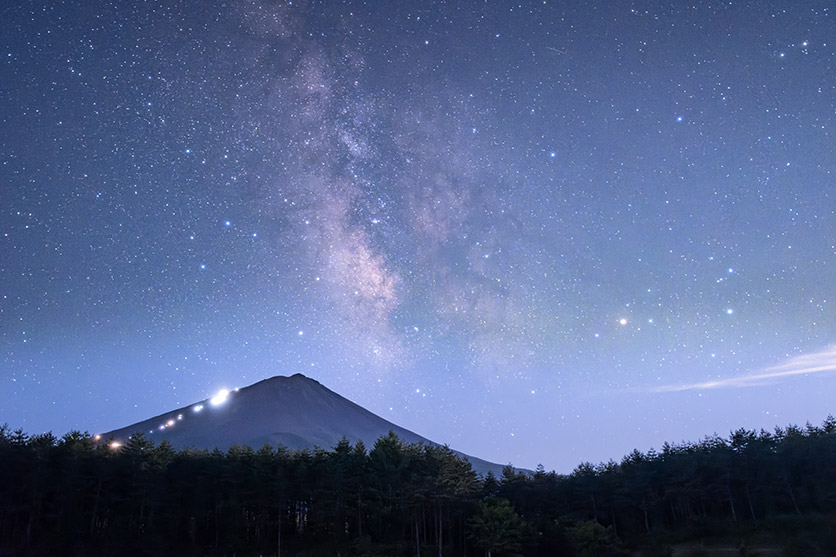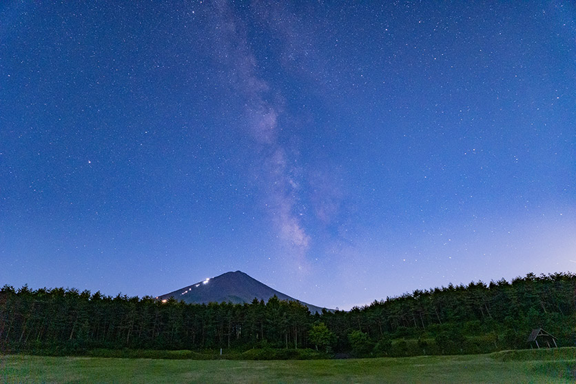 夏の風物詩である、富士登山者の灯りです。昨年はコロナ禍の影響で開山しませんでしたが、今年は多くの登山者が訪れました。今回は富士山の北側から撮影し、南中する天の川と一緒に撮影をしました。さらに広角11mmで手前の青々とした風景を一緒に写し込み、夏らしさを画面いっぱいで表現しています。