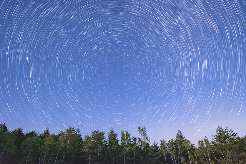 カメラを北極星の方に向けインターバル撮影したものを比較明合成しました。広角11mmで撮影することで、北極星を探す目印の星座であるカシオペヤ座とおおぐま座の北斗七星を一緒に写すことができます。比較明合成の定番とも言える構図ですが、快晴の日にはぜひ挑戦していただきたい作品です。