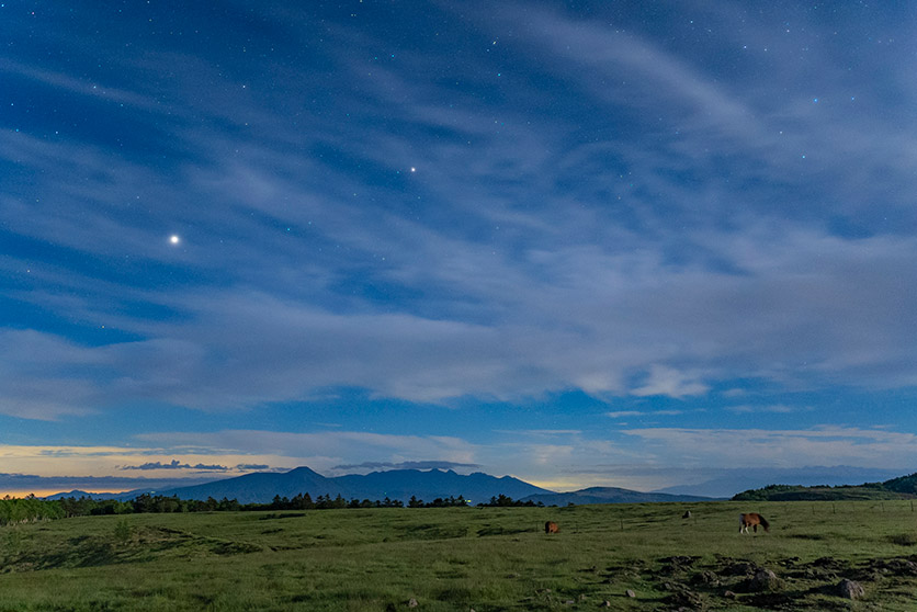 夏の夜空の中でもひときわ明るく輝く、木星と土星をクローズアップして撮影しました。広々とした草原を自由に動き回るポニーや、八ヶ岳、蓼科山などの山並みを一緒に写し込むことで、星の要素が少ない場面でしたが、情景豊かに切り取ることができました。