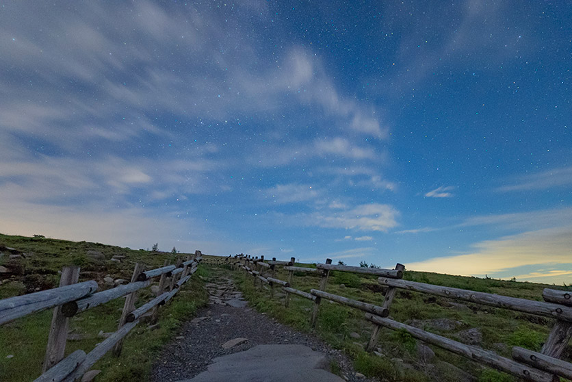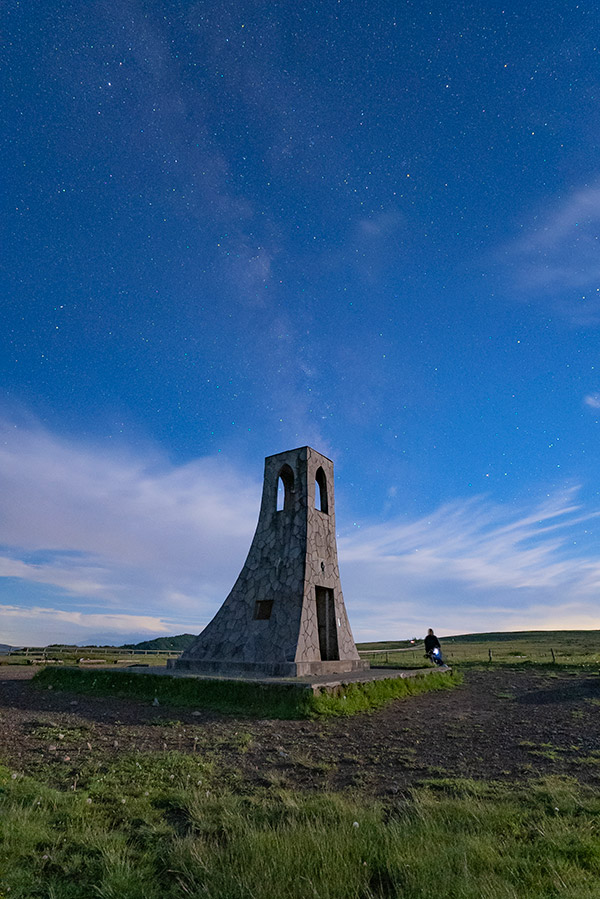 美ヶ原高原にて撮影した南中する天の川と美しの塔の作品です。あえて人を構図の中に入れることで、塔のスケール感を表現しています。フルサイズのAPS-Cモードを使用して撮影を行なっていますが、画素数が多いフルサイズカメラであれば、解像感などを気にすることなく撮影することができます。