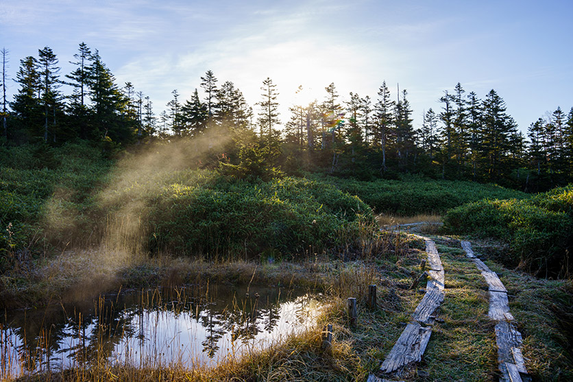 色のりがいい理由はコントラストと書きましたが、この写真をご覧ください。明るい場所と暗い場所との差がきっちり出る場所。湿地帯を歩いていたら、いきなり池からモヤが出ました。せいぜい10秒くらいで、慌ててシャッターを切りましたが、撮れた画に惚れ惚れしました。こういう時、光のコントラストをうまく拾ってくれないレンズでは、暗い部分の階調性が感じられなく、デフォルメされた印象になってしまいます。でも暗い部分、特に木の舗装の色合いや奥の森の暗い緑が、ちゃんとそれぞれ出ているからこそ、モヤのふわっとした光が引き立ち、この場にいた時そのままの画が、レンズを通して定着されるのです。明るい部分が生きるのは、暗い部分の光と色をレンズがちゃんと拾って、しっかりと線を解像してくれるからなのです。