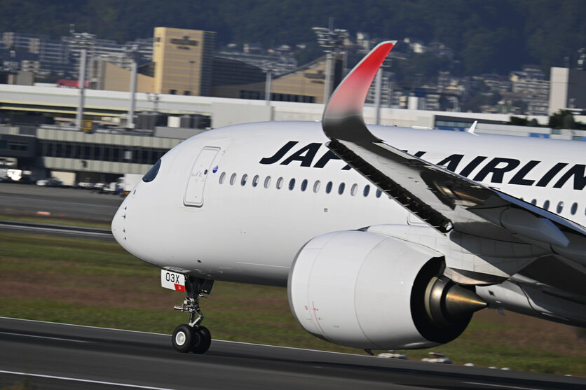 日本航空(JAL)の最新鋭エアバスA350型機を、伊丹空港で撮影。A350の特徴であるコクピットの機体前部と、翼の先端も入れました。レンズの最大焦点距離500mmを生かし、機体にここまで近寄って撮ることができると、とても迫力ある作品作りができます。