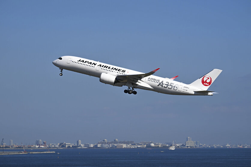 晴れわたった日の飛行機撮影は、順光である場所から始まります。大型機から小型機まである旅客機では、機体ごとにズーム幅を調整していきながら、最適な構図を決めます。青空の日はズームを引き気味に、きれいな空も入れて撮りたいところ。機体のデザインが美しいA350型機が、ちょうど良い位置から離陸してくれました。
