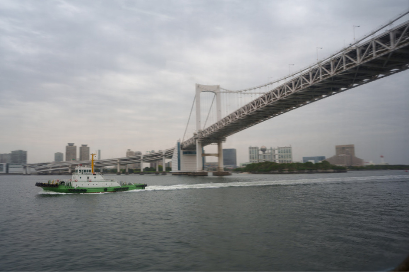 伊豆大島へは高速船「セブンアイランド号」で向かいます。窓側の席に座れば東京湾沿いの風景を楽しむことができ、レインボーブリッジを通過するタイミングですれ違った漁船を流し撮りして遊んでみました。軽量かつコンパクトな20-40mm F2.8は、狭い船内でも取り回しが容易です。