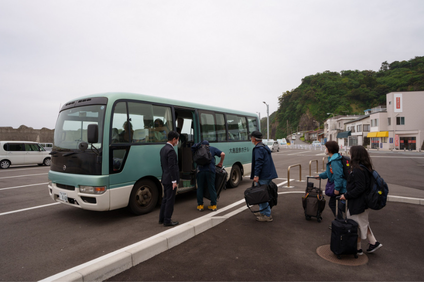 港では今回お世話になる伊豆大島温泉ホテルさんの送迎バスが出迎えてくれました。みなさん大きな荷物に悪戦苦闘しながらバスに乗り込んでいきます。今回の撮影ツアーは「こと座流星群」の極大日に合わせて設定していたため、複数台のカメラを持ってこられている方もチラホラいらっしゃいました。あとは天気が味方をしてくれるのを期待するだけですが、島の上空は厚い雲に覆われていて、祈るのみです。