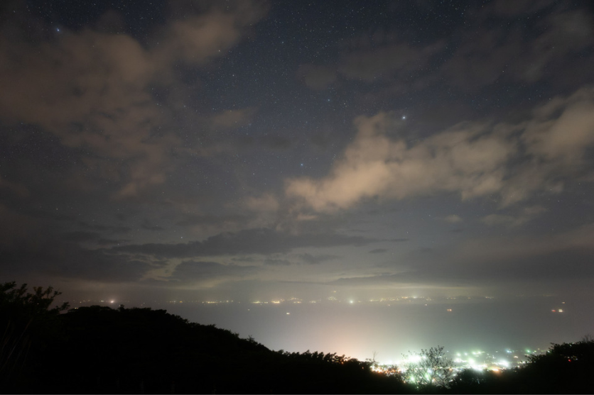 今回のツアーでは、事前にオンライン講習を行い、私から撮って欲しい被写体の紹介をしていました。その中でも目玉であった「マジックアワー中に沈む細い月とおうし座のすばるの接近と熱海方面の夜景」は、残念ながら雲に阻まれて撮ることができませんでした。この雲の向こうに月とすばるがあり、それを 35-150mm F2-2.8で撮影するのを楽しみにしていただけにとても残念でした。