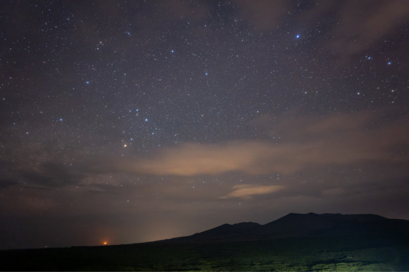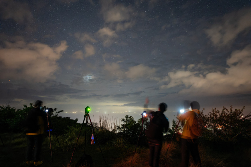 撮影実習の後半ではホテルの屋上にて三原山と星空を撮影しました。ここでの狙いは三原山と南中する天の川の撮影ですが、移動直後は雲がたくさんあったことと、夜中の2時以降にならないといい位置に天の川がやってこないため、まずはどれくらいの画角で撮影するかのシミュレーションを行い、少し仮眠をして夜中の撮影に備えることになりました。