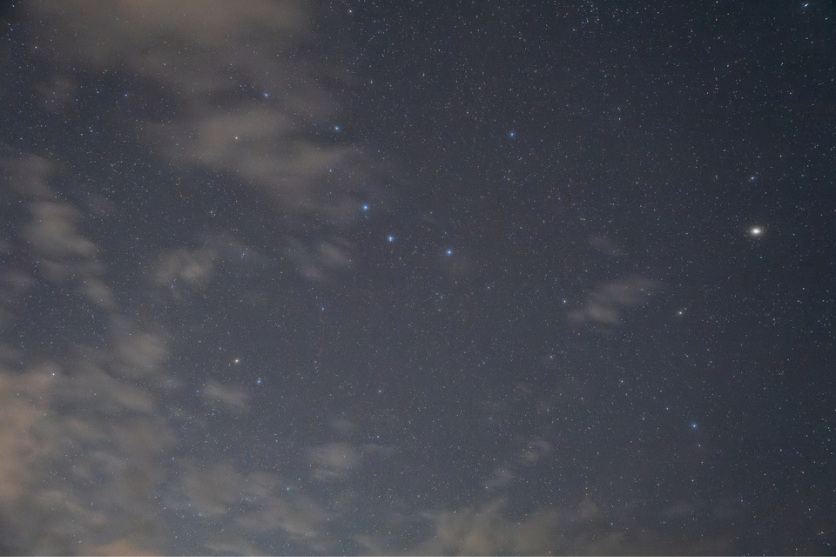 撮影実習中、昇る春の星座も撮影することができました。その代表格であるおおぐま座の北斗七星が雲間から顔を出しています。このように星座や特徴的な星の並びを撮影する際は、必ずソフトフィルターを使うようにしています。この写真は20-40mm F2.8にH&Yフィルターの「Magnetic White Promist 1/4」を取り付けて撮影しています。
