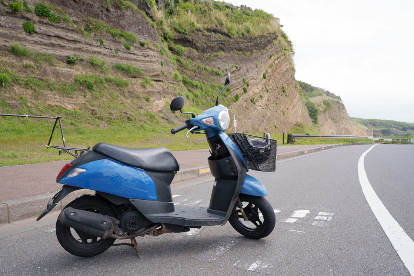 2日目午前のフリータイムは、レンタルバイクを借りて島内の景勝地を巡りながらスナップ撮影することにしました。伊豆大島は一周が約40kmで、原付バイクでも2時間程度あれば十分回ることができます。伊豆大島の景勝地でも特に人気なのがバームクーヘンの断面のように見える「地層大切断面」ですが、それと一緒に今回の相棒のレンタルバイクを撮影してみました。