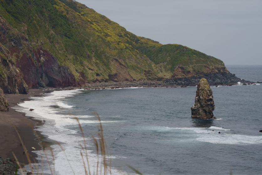 この写真の海に聳え立つ奇岩は筆島と呼ばれています。撮影した展望台からの眺めは格別です。ここは日本の渚100選にも選ばれている美しい場所ですが、荒波が押し寄せる場所でサーファーにも人気です。筆島はその過酷な環境でも崩れることなく立っていることから「神の宿る岩」とも呼ばれています。筆島の大きさがわかるように、砂浜を歩くサーファーを入れ込んだ画角をチョイスしました。