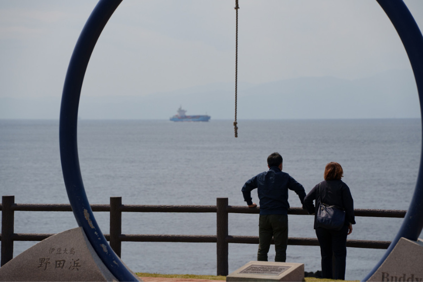 野田浜は伊豆大島の北西に位置しており、夕景観望スポットとして有名です。目を惹く鐘のモニュメントがあり、密かな写真映えスポットにもなっています。ここからは海を挟んで伊豆半島も見ることができ、天気の良い日は富士山も見ることができます。タイミング次第で元町港に入出港するジェット船や大型客船、さらに貨物船や漁船など様々な船が行き交う様子を見ることができるので、望遠レンズを持ってのんびり撮影するのも面白いでしょう。