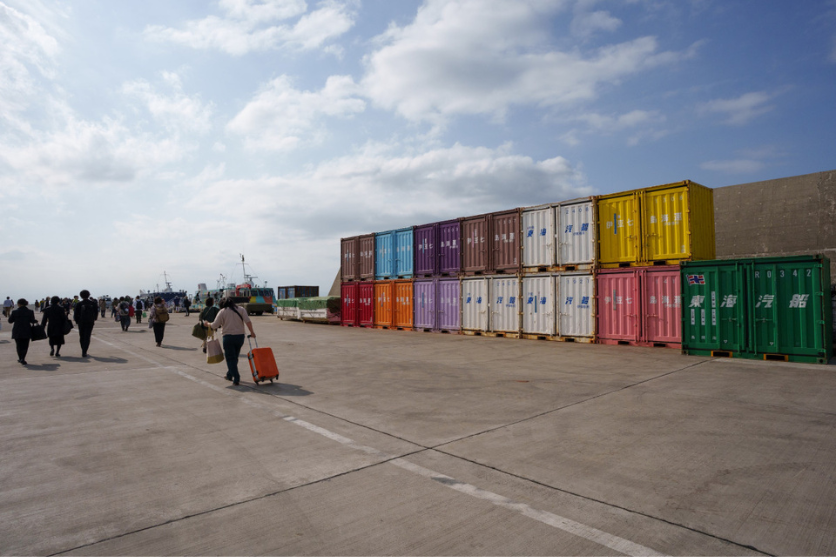 復路便の出発港は岡田港でした。今回のツアーの主催でもある東海汽船さんのカラフルなコンテナが並ぶ港を過ぎると、私たちが乗船するジェット船が待っています。頭上はこの旅一番の青空が広がっており、この晴れ間が夜にあればと少し恨めしい気持ちになりましたが、またのお楽しみということで、みなさん笑顔で帰られました。