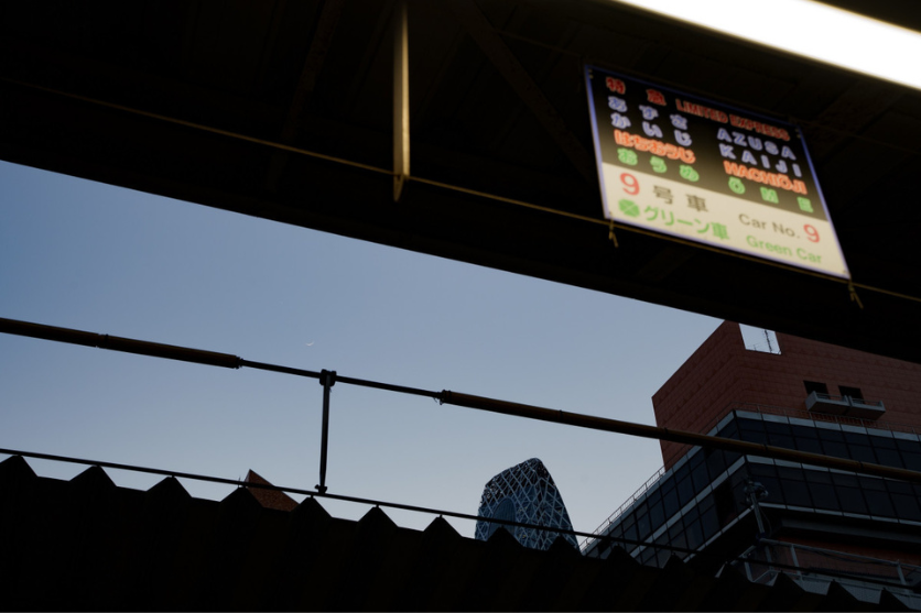 帰路の途中、新宿駅のホームでふと空を見上げると、昨日雲に阻まれて撮れなかった細い月がぽっかりと空に浮かんでいました。ホームの天井のわずかな隙間から月を見ていると、まるで昨日会えなかった代わりに今日会いに来てくれたように感じて、カメラを取り出し撮影することにしました。サンドウィッチ構図で空に浮かぶ月を強調して撮影を行なっています。