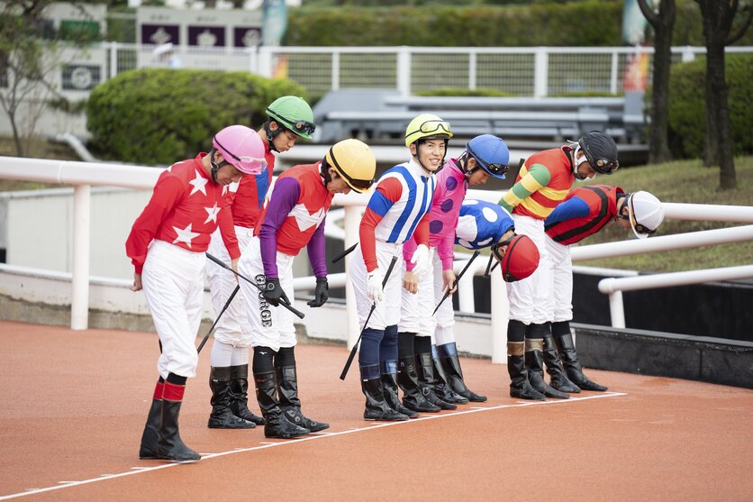 大井競馬場のパドックでの撮影です。次のレースに騎乗するジョッキーたちが騎乗の合図と共に姿を見せ、一礼をして騎乗馬のもとへ向かう瞬間を狙ってみました。自分は単焦点のレンズを使うことが多いのですが、この時はジョッキー全員の姿を収めようと考えていたので、状況に応じて瞬時に焦点距離を変えられるズームレンズはやはり便利ですね。
