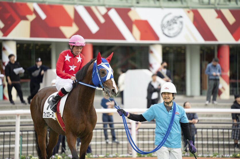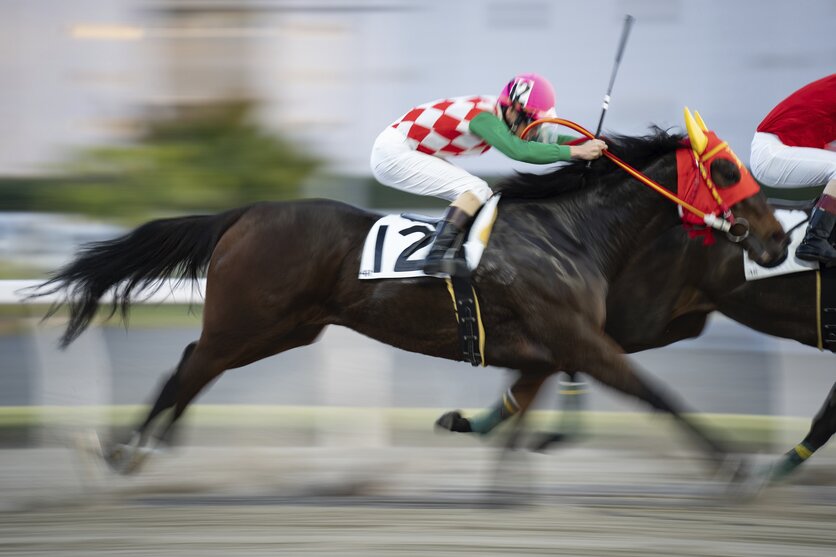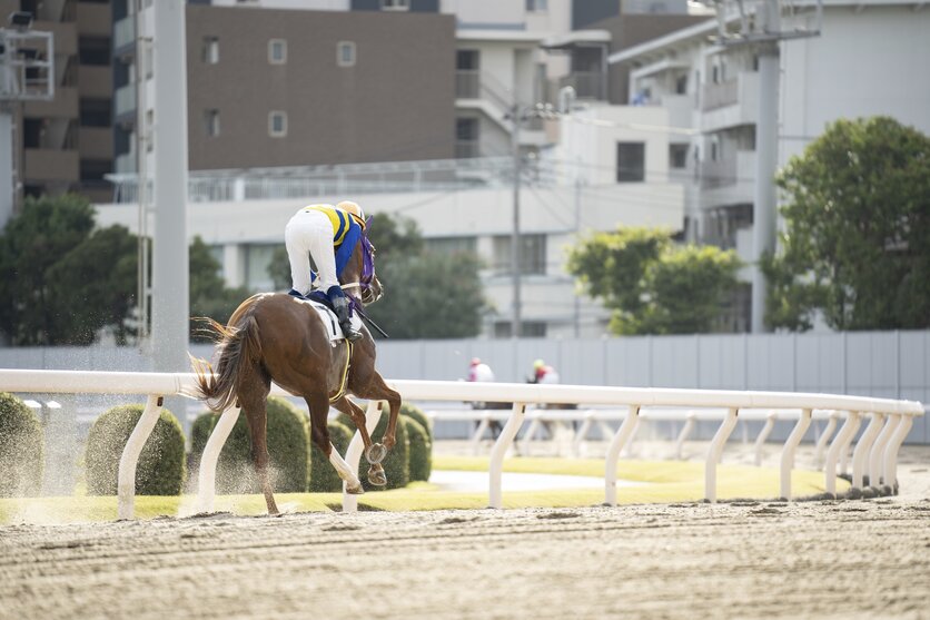日中、陽射しがある場面で、返し馬の姿を撮影したものです。レース中の人馬をしっかりと止めて撮影する場合は、最低でも1/1000のシャッタースピードが必要だと感じていますが、全力疾走ではない返し馬なら1/640秒くらいのシャッタースピードでも問題はありません。