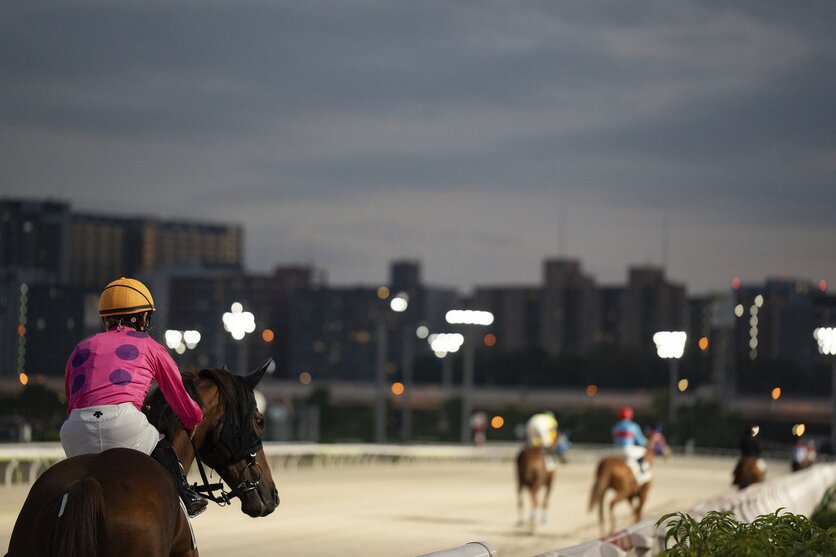 陽が落ちて場内の照明に灯かりが灯ると、ナイター競馬の雰囲気が出てきます。レースへと向かう人馬がコースに入場し、返し馬に入る前の一枚。競馬は基本的に動きものの撮影なので、シャッタースピードをあまり遅くすることはできません (流し撮りなどは別ですが)。となると単純に光量が足りないケースも多くなり、最低でもF値は2.8が欲しいところ。機材には過酷な状況ですがしっかりフォーカスしてくれました。