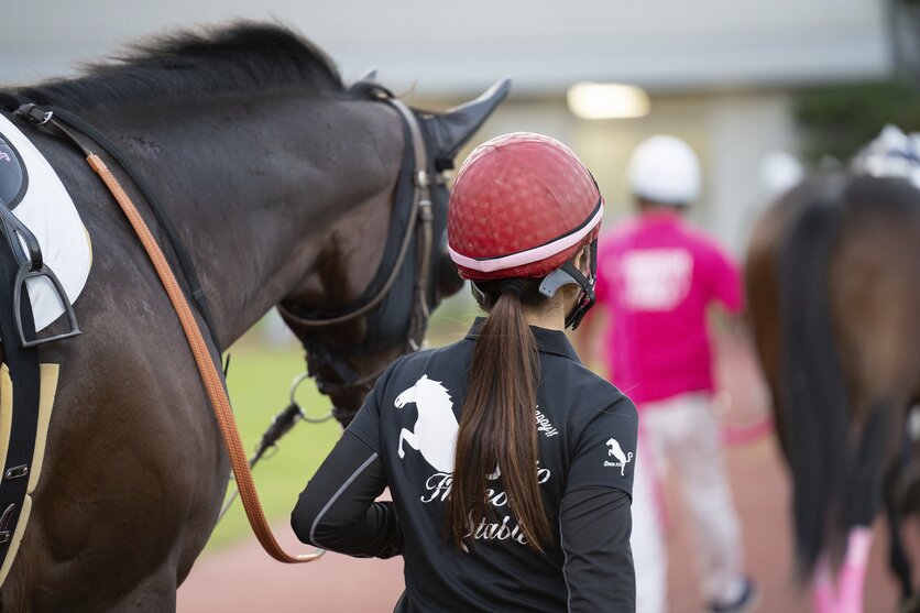 大井競馬場より更に馬たちを近くで観ることが出来る川崎競馬場のパドックでのシーンです。180mmでも十分に寄って撮影することが出来ます。愛馬を曳く女性厩務員さんをフォーカスしてみました。
