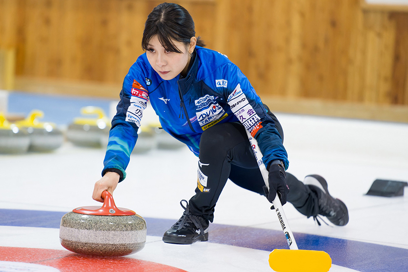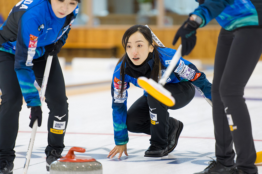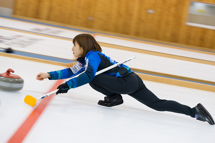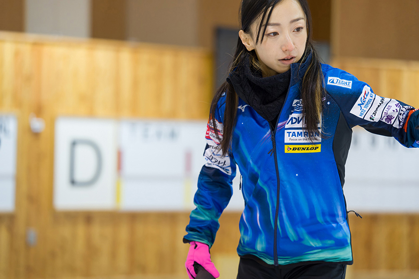 VCオン、シャッタースピード1/30秒のスローシャッターで、鈴木夕湖選手の低く美しい姿勢でストーンを投てきする姿を狙いました。
