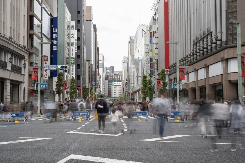 休日の歩行者天国は多くの人が縦横無尽に様々なスピードで行き交うので、スローシャッター撮影によって、人の動き・時間の流れを表現できます。