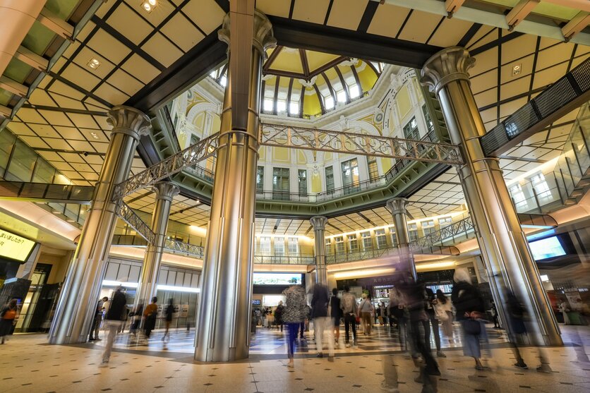 多くの人が行き交う歴史ある東京駅の丸の内駅舎です。大正時代の姿に復元された丸の内駅舎のドーム屋根の内側や壁には、細やかな彫刻が施されています。17mmのワイドな焦点距離を活かせるローアングルでの撮影で、歴史ある駅舎の荘厳さを引き出すことができます。